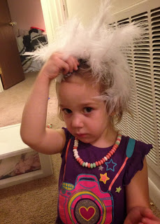 SJ got a hold of the white feathers that were used for the angel ornament and she stuck them all in her head band.