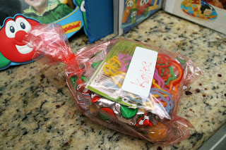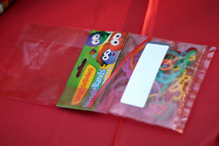 I used veggie tales silly bands as the party favor and put one inside each party bag along with a twist tie. Then I stuck a white label on each one so that guests could write their names and use their bags to gather the pinata candy.