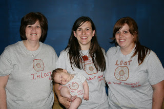 After 6 seasons of Lost viewers started loosing interest and much like the cast members that were killed off in the show, our little fan club dwindled over time. However for the series finale we made a special effort to get together and celebrate this momentous occasion like old times. My friend made some rockin’ t-shirts. Mine said LOST on top and had the Dharma logo then at the bottom it said “we want answers 5-23-10” we have since joked about inserting the word “still” now that it’s over. SJ’s onesie said “I’m a little lost”.