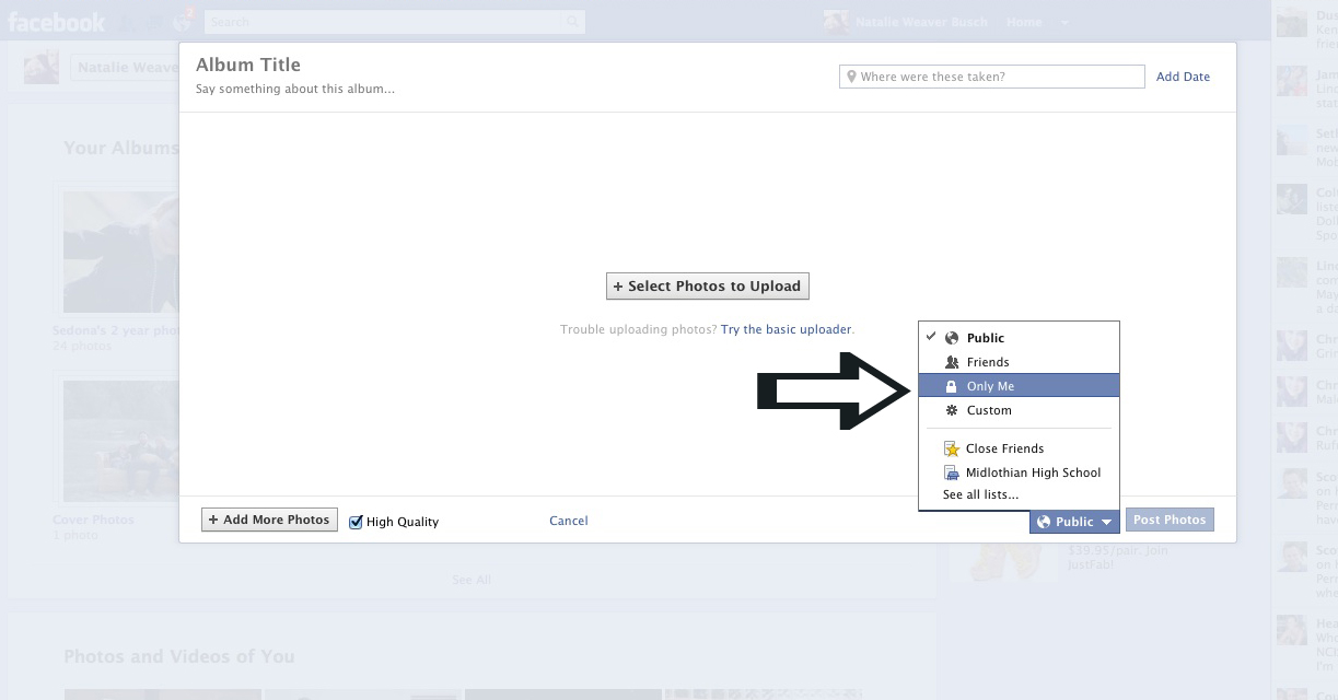 3.On the right there is a drop down menu that says “public” and when you click on it you can customize who you want to be able to see the photos. If you don’t necessarily won’t to post the photos to your home page then you can select “Only me” and no one else will be able to view your photos, but they are there if you ever had a computer crash like mine did.