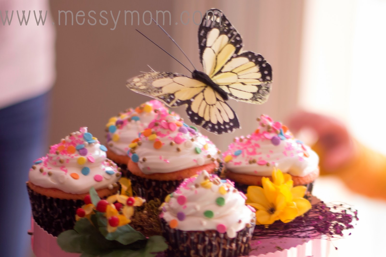 The birthday cake was a tower of cupcakes decorated with flowers, sprinkles, and butterflies!